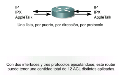 Las ACL se definen según el protocolo, la dirección o el puerto. Para controlar el flujo de tráfico en una interfaz, se debe definir una ACL para cada protocolo habilitado en la interfaz. Las ACL controlan el tráfico en una dirección por vez, en una interfaz. Se necesita crear una ACL por separado para cada dirección, una para el tráfico entrante y otra para el saliente. Finalmente, cada interfaz puede contar con varios protocolos y direcciones definidas. Si el router tiene dos interfaces configuradas para IP, AppleTalk e IPX, se necesitan 12 ACLs separadas. Una ACL por cada protocolo, multiplicada por dos por dirección entrante y saliente, multiplicada por dos por el número de puertos.