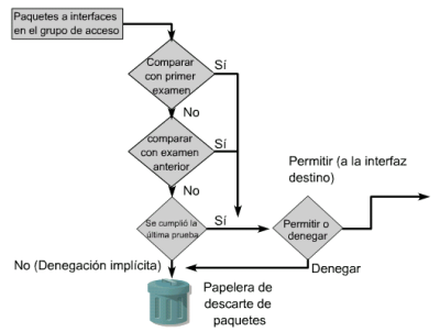 A manera de revisión, las sentencias de la ACL operan en orden secuencial lógico. Si se cumple una condición, el paquete se permite o deniega, y el resto de las sentencias de la ACL no se verifican. Si todas las sentencias ACL no tienen coincidencias, se coloca una sentencia implícita que dice deny any (denegar cualquiera) en el extremo de la lista por defecto. Aunque la línea deny any no sea visible como última