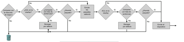 Si se acepta la dirección de la trama, la información de la trama se elimina y el router busca una ACL en la interfaz entrante. Si existe una ACL, entonces se verifica si el paquete cumple o no las condiciones de la lista. Si el paquete cumple las condiciones, se lleva a cabo la acción de aceptar o rechazar el paquete. Si se acepta el paquete en la interfaz, se lo compara con las entradas de la tabla de enrutamiento para determinar la interfaz destino y conmutarlo a aquella interfaz. A continuación, el router verifica si la interfaz destino tiene una ACL. Si existe una ACL, se compara el paquete con las sentencias de la lista y si el paquete concuerda con una sentencia, se lleva a cabo la aceptación o el rechazo del paquete. Si no hay ACL o se acepta el paquete, el paquete se encapsula en el nuevo protocolo de Capa 2 y se envía por la interfaz hacia el dispositivo siguiente.