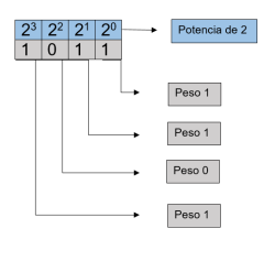 Las posiciones del dígito en binario deben coincidir con las posiciones de la tabla. Esto nos indicará que valor representa cada dígito en el ejemplo, tenemos las posiciones 0, 2 y 3 con dígito 1