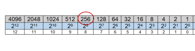 Es 256, esto nos indica que necesariamente ese dígito binario tiene que estar en 1 o “encendido”, por lo tanto el numero binario tendría 9 posiciones, ya que la posición 8 (28=256) debe estar, lo que implica que todas las anteriores estén.