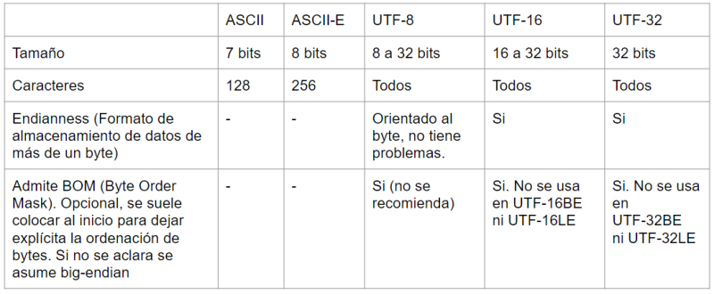 En el caso de las computadoras sólo entienden números por lo que buscamos representar los caracteres como números. Ejemplos: EBCDIC, ASCII, UTF-8, UTF-16, UTF-32, entre otros.