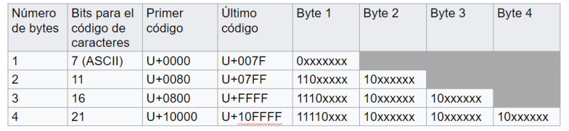 - Utiliza símbolos de longitud variable; eso significa que diferentes caracteres pueden codificarse con distinto número de bytes.