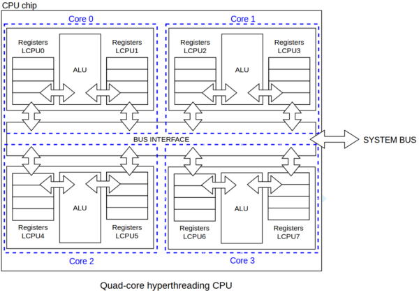A nivel de sistema operativo, al usuario de un sistema con un procesador quad-core se le indicaría que tiene 4 CPU’s, pero serían 4 cpus lógicas (LCPU), no físicas. Si además ese procesador incorporara la tecnología HyperThreading, los comandos como htop o nproc indicarían que hay 8 cpus en el sistema, pero ofrecería un menor rendimiento que si se trataran de 8 cpus provenientes de un único procesador octa-core sin HyperThreading.