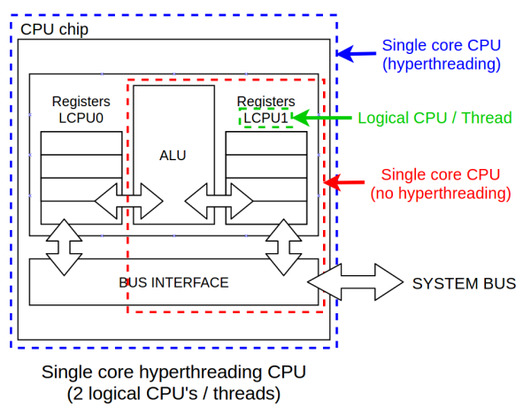 Así, desde el punto de vista de Linux o de cualquier otro sistema operativo, una máquina con un único procesador de un solo core o núcleo, pero con la tecnología HyperThreading, aparecería ante nuestros ojos como que tiene 2 CPU’s. Pero se trataría de dos cpus lógicas correspondientes a una única CPU física.