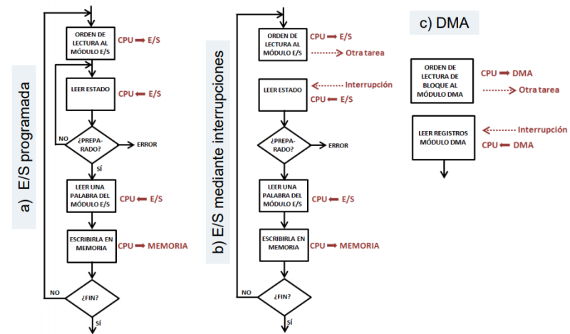 En esta alternativa es el procesador el encargado de monitorear todos los dispositivos de entrada/salida, por lo que cada cierto tiempo el procesador debe consultar a los diferentes dispositivos cual es su estado y en caso de que requieran transferir información a la memoria principal, es el procesador quien debe ocuparse de atender esos pedidos.