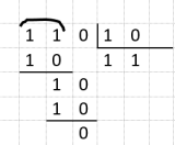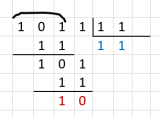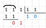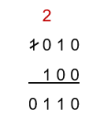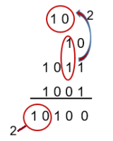 ¿Cómo será esta operación en binario? Tengamos presente que los únicos dígitos posibles en el cociente son 1 y 0, de forma similar a la multiplicación el problema acá sera restar y no dividir. Veamos un caso simple.