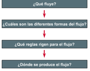 El concepto de capas le ayudará a comprender la acción que se produce durante el proceso de comunicación de un computador a otro. En la figura se plantean preguntas que involucran el movimiento de objetos físicos como por ejemplo, el tráfico de autopistas o los datos electrónicos. Este desplazamiento de objetos, sea este físico o lógico, se conoce como flujo. Existen muchas capas que ayudan a describir los detalles del proceso de flujo. Otros ejemplos de sistemas de flujo son el sistema de suministro de agua, el sistema de autopistas, el sistema postal y el sistema telefónico.