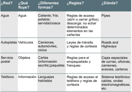 Ahora, examine la figura el cuadro “Comparación de redes”. ¿Qué red está examinando? ¿Qué fluye? ¿Cuáles son las distintas formas del objeto que fluye? ¿Cuáles son las normas para el flujo? ¿Dónde se produce el flujo? Las redes que aparecen en este esquema le ofrecen más analogías para ayudarlo a comprender las redes informáticas.