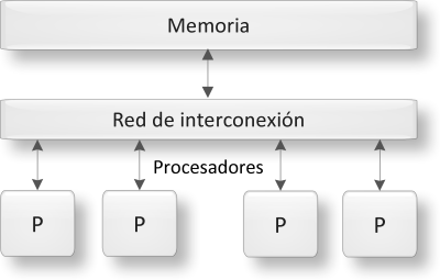 Un multiprocesador de memoria compartida consiste en dos o más unidades de procesamiento conectadas a múltiples módulos de memoria. La forma de conexión de estos elementos es a través de algún tipo de red de interconexión como puede ser un switch crossbar o un bus. En estos sistemas, existe un único espacio de direcciones, por lo que todas las unidades de procesamiento pueden acceder a la misma dirección de memoria, y modificar los datos almacenados en este espacio compartido. Si todas las unidades de procesamiento tienen el mismo tiempo para acceder a cualquier dirección de memoria, entonces se dice que el multiprocesador tiene acceso uniforme a memoria (UMA). Por el contrario, si el tiempo de acceso a algunas direcciones de memoria es mayor que a otras, entonces se dice que el multiprocesador es de acceso no uniforme a memoria (NUMA).