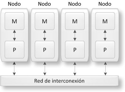 Una plataforma de memoria distribuida consiste de varios nodos de procesamiento independientes con módulos de memoria locales, esto significa que cada uno cuenta con su propio espacio de direcciones. Además, estos nodos están conectados por una red de interconexión. Cada nodo puede ser una computadora individual o un multiprocesador de memoria compartida. Al contar con su propio espacio de memoria, el mismo no es accesible por el resto y los nodos deben comunicarse entre si enviándose mensajes. Éste intercambio de mensajes es utilizado para transferir datos, trabajo y sincronizar acciones entre nodos